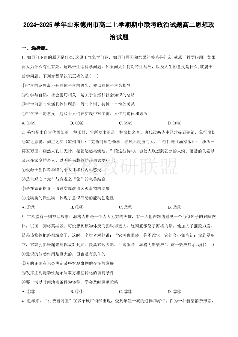 山东省德州市2024-2025学年高二上学期11月期中考试 政治