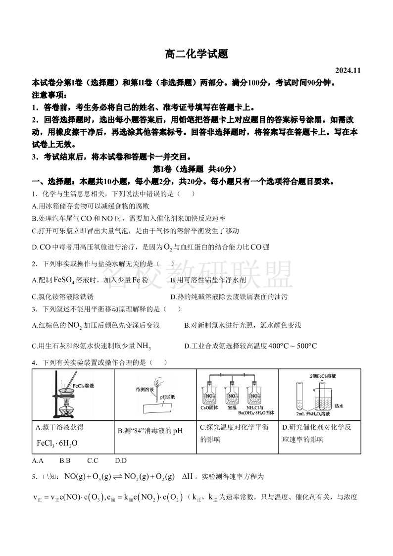 山东省德州市2024-2025学年高二上学期11月期中考试 化学