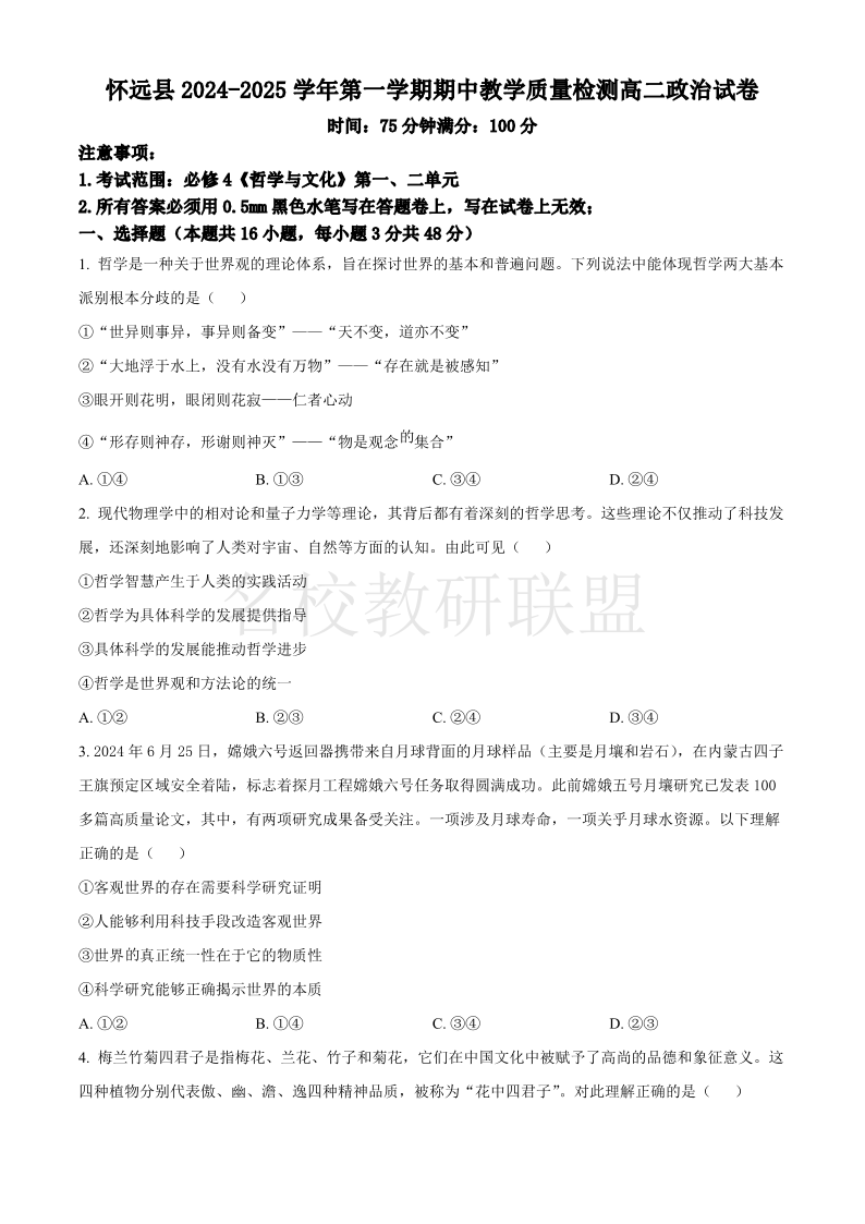 安徽省蚌埠市怀远县2024-2025学年高二上学期11月期中考试 政治