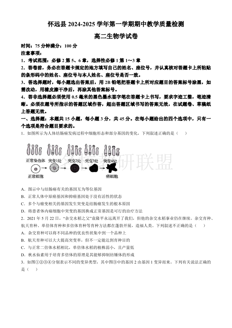安徽省蚌埠市怀远县2024-2025学年高二上学期11月期中考试 生物