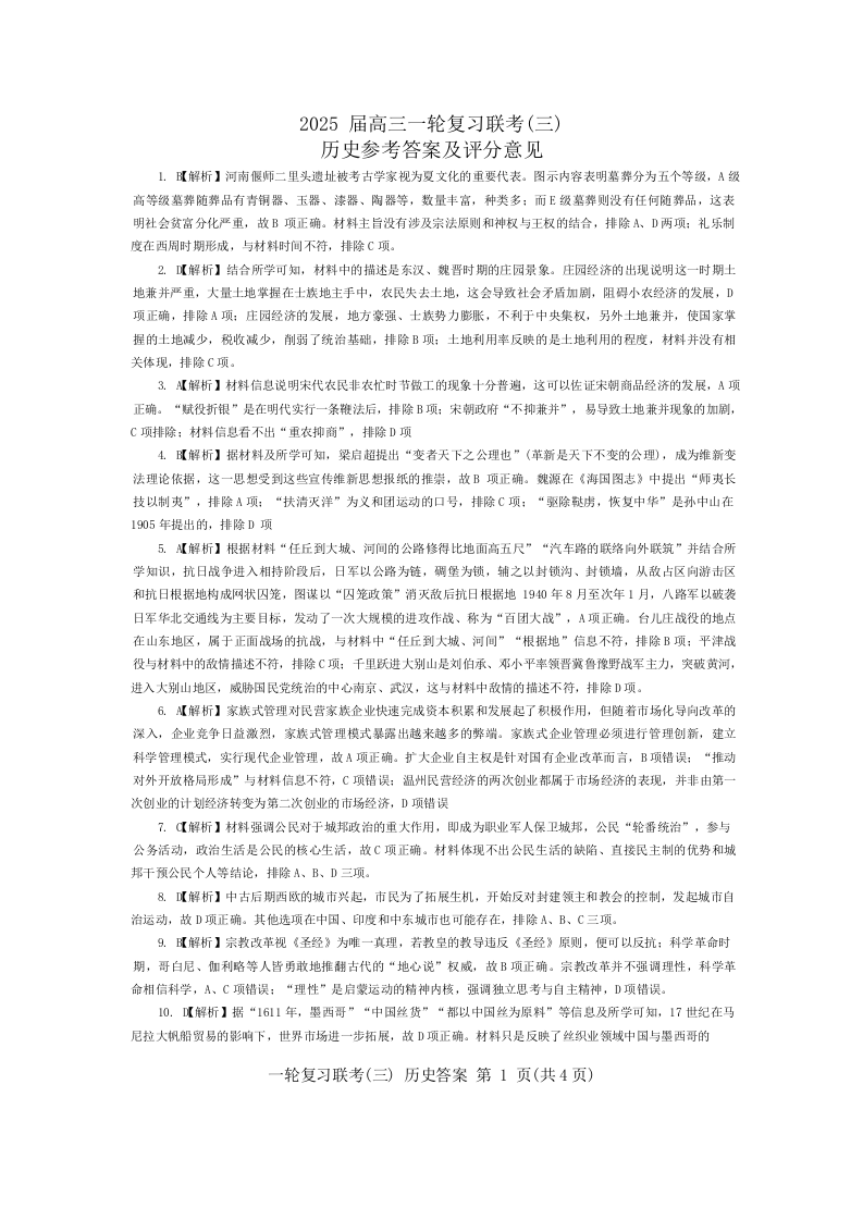 百师联盟2025届高三一轮复习联考(三)历史答案