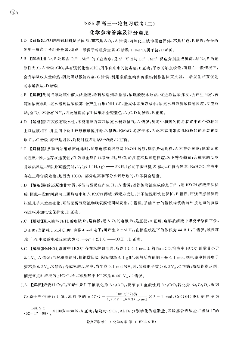 百师联盟2025届高三一轮复习联考(三)化学答案