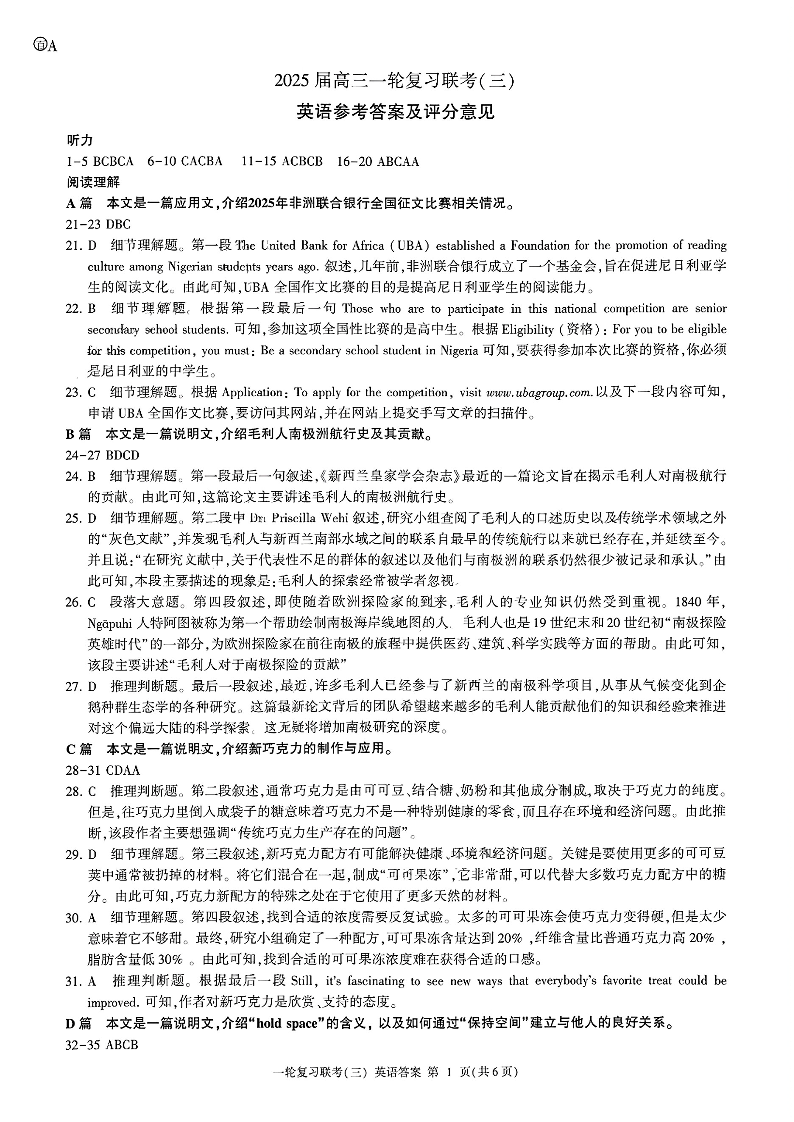 百师联盟2025届高三一轮复习联考(三)英语答案