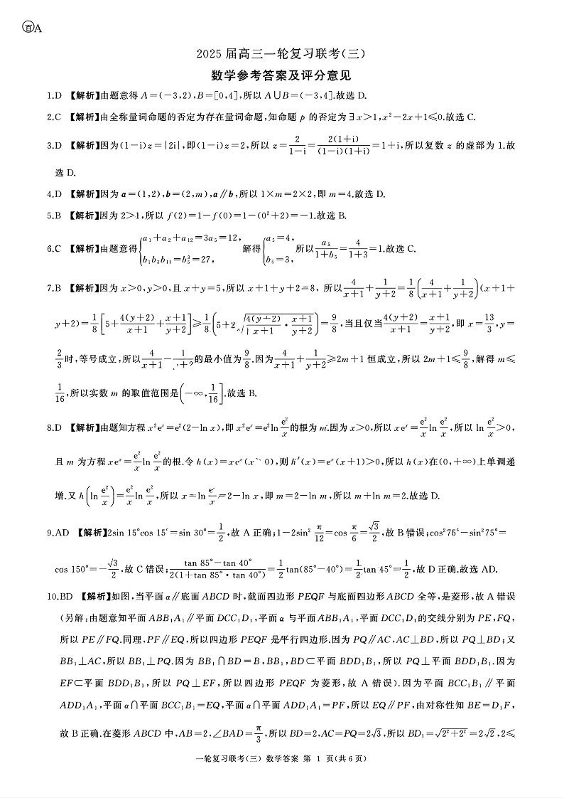 百师联盟2025届高三一轮复习联考(三)数学答案