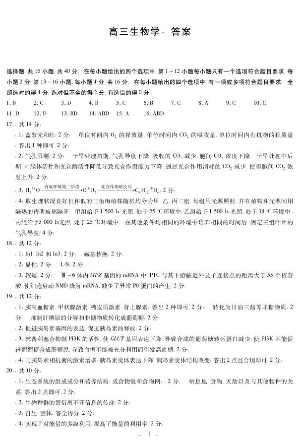 湖南省天一大联考2024-2025学年高三上学期11月联考 生物答案