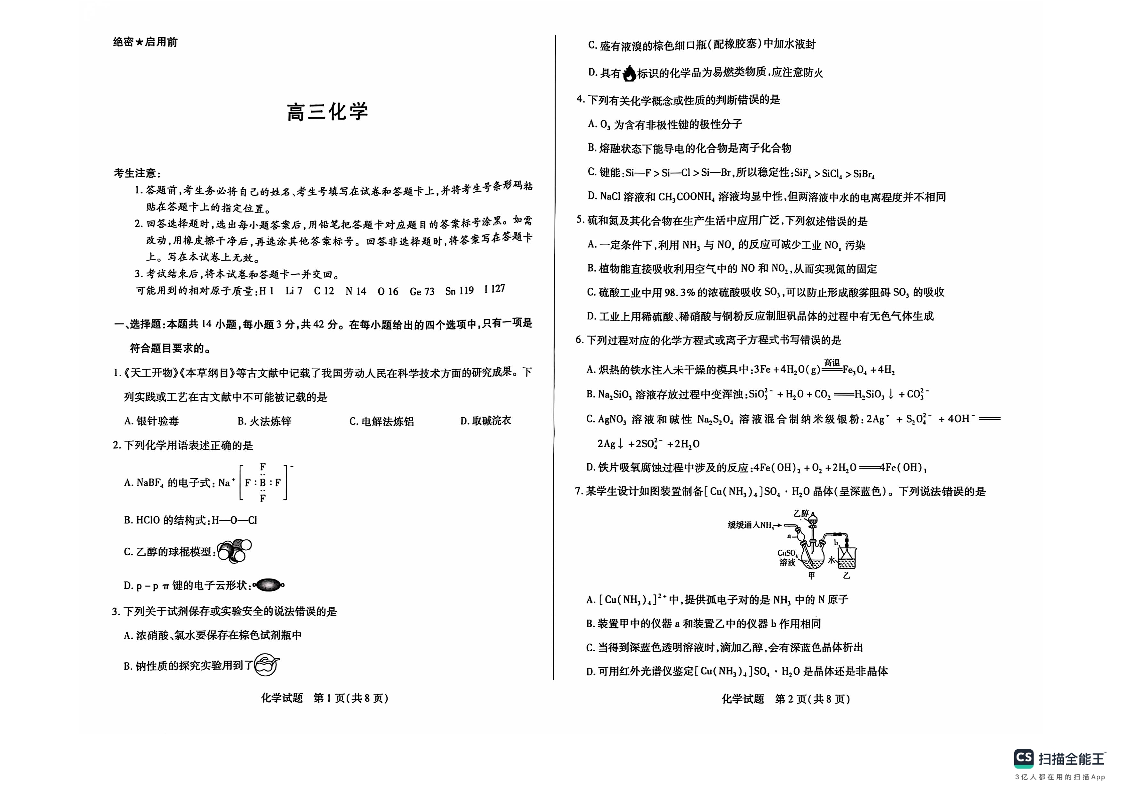 湖南省天一大联考2024-2025学年高三上学期11月联考 化学