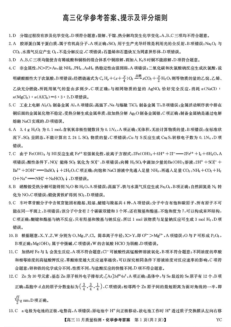 河南省创新发展联盟2024-2025学年高三上学期期中质量检测 化学答案