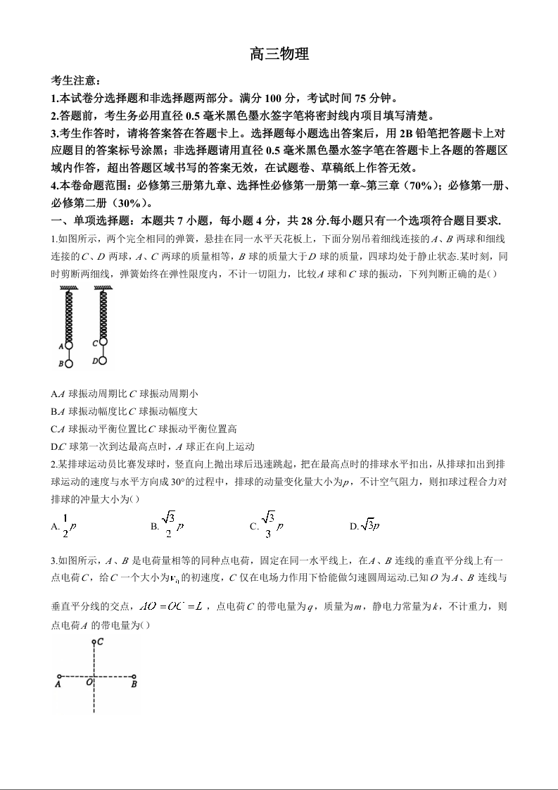 河南省创新发展联盟2024-2025学年高三上学期期中质量检测 物理