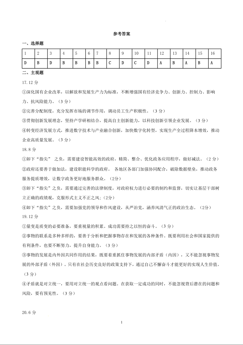 江苏省南京市六校联合体2024-2025学年高三上学期11月联考 政治答案