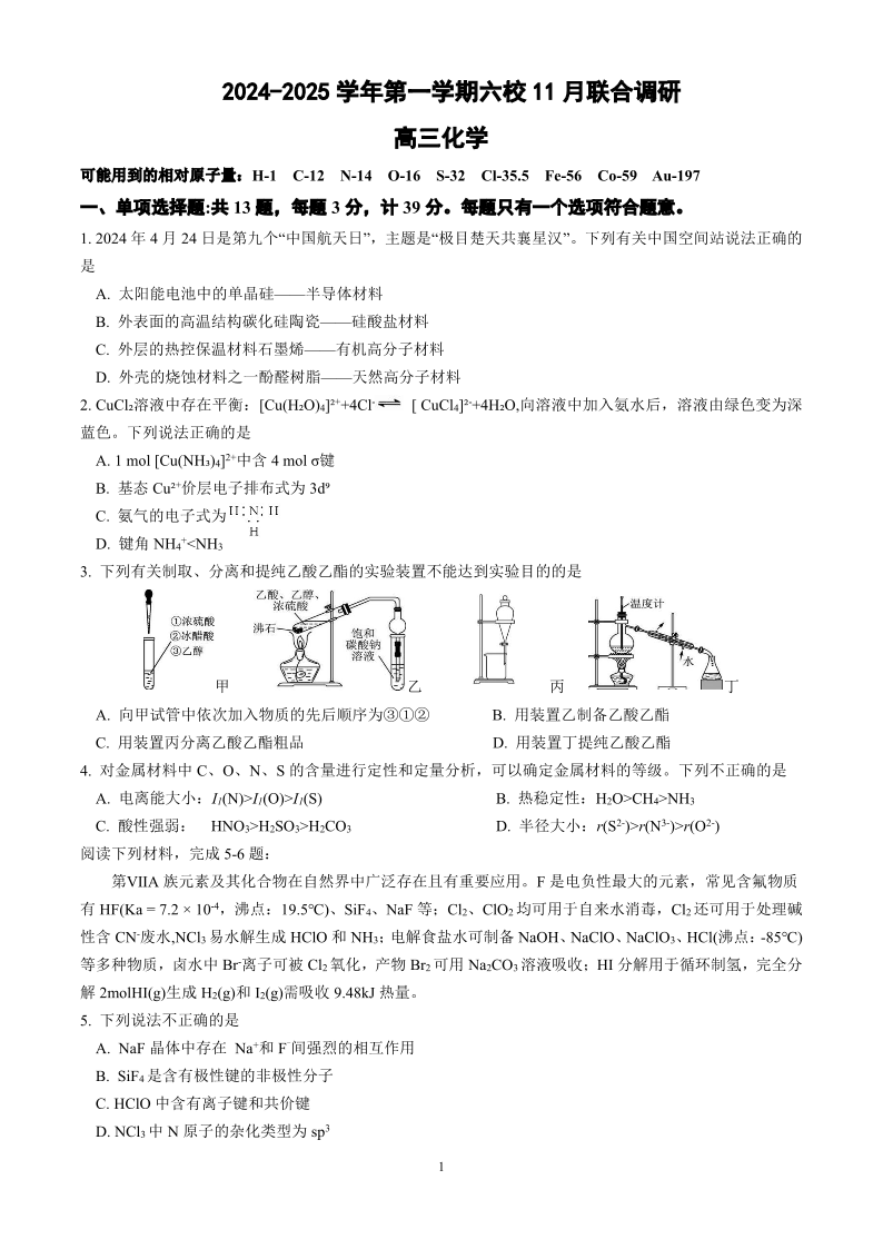 江苏省南京市六校联合体2024-2025学年高三上学期11月联考 化学