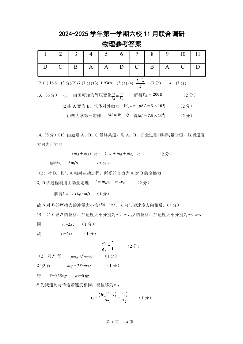 江苏省南京市六校联合体2024-2025学年高三上学期11月联考 物理答案