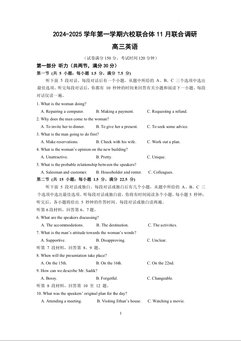 江苏省南京市六校联合体2024-2025学年高三上学期11月联考 英语