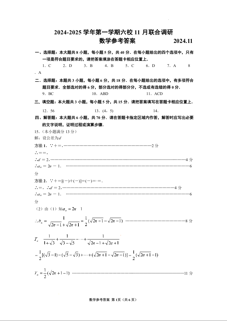 江苏省南京市六校联合体2024-2025学年高三上学期11月联考 数学答案