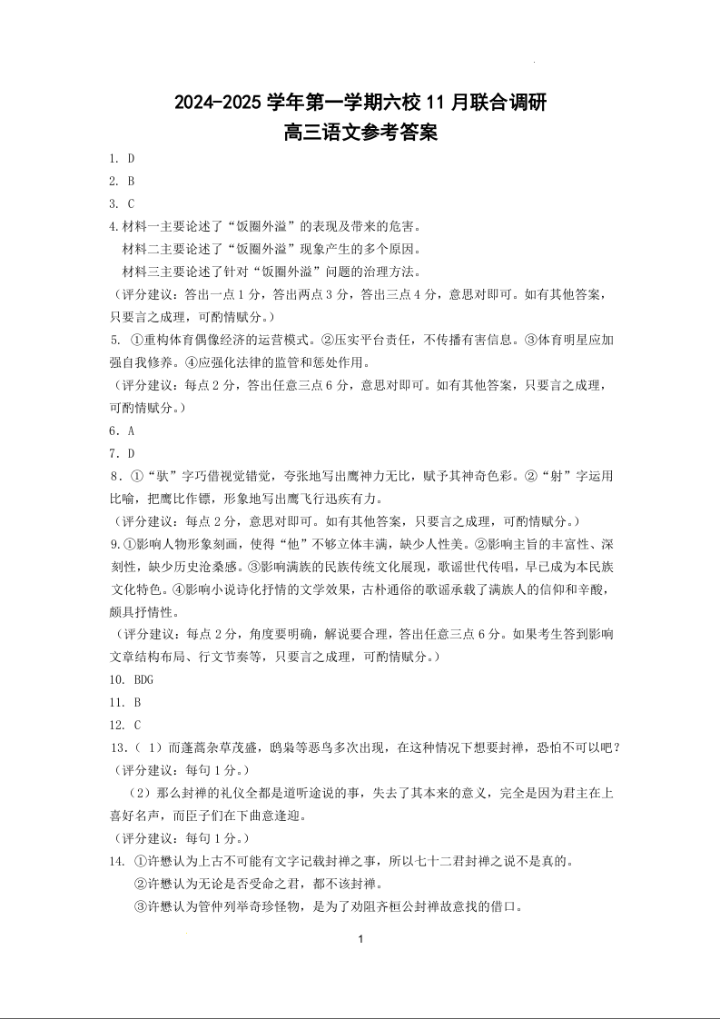 江苏省南京市六校联合体2024-2025学年高三上学期11月联考 语文答案