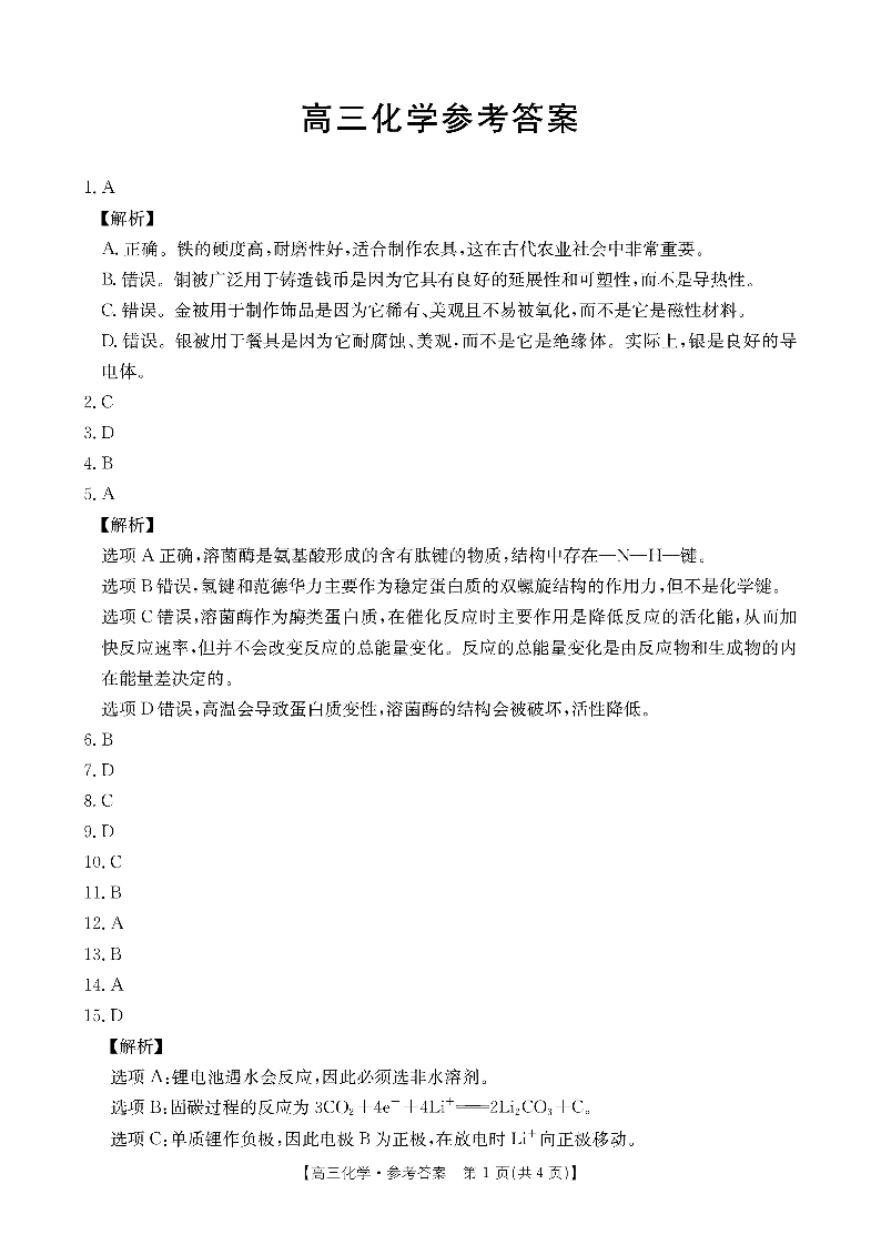 广东省部分高中学校2024-2025学年高三上学期11月期中联考 化学答案