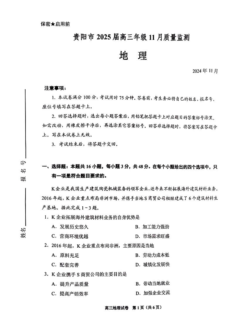 贵州省贵阳市2025届高三年级11月质量监测试卷 地理