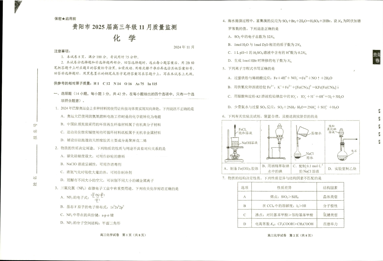 贵州省贵阳市2025届高三年级11月质量监测试卷 化学