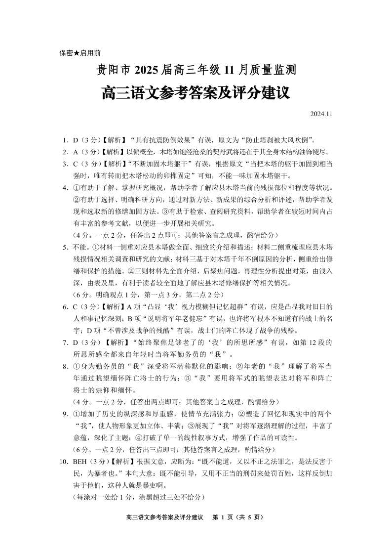 贵州省贵阳市2025届高三年级11月质量监测试卷 语文答案