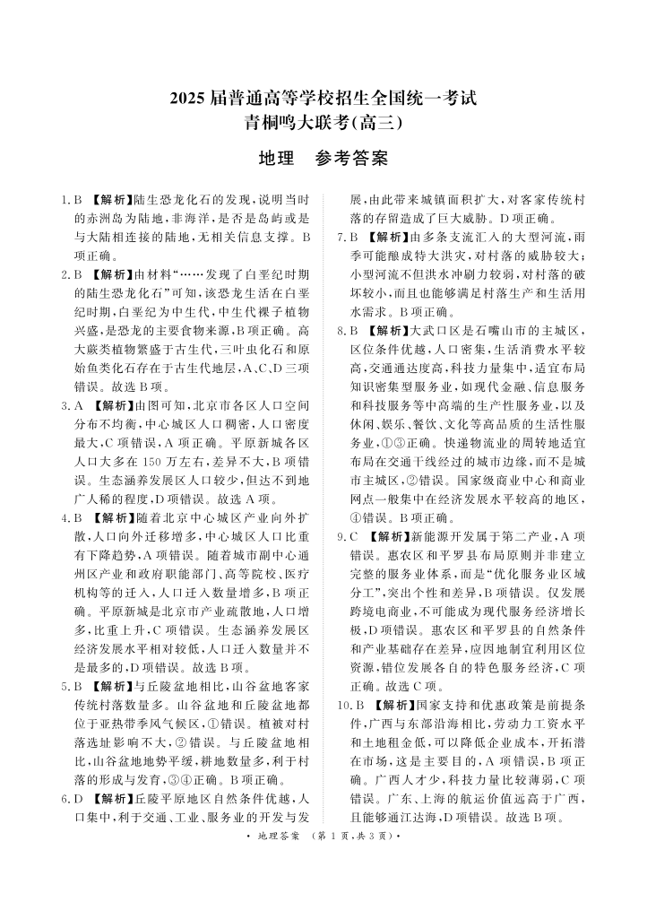 河南省重点高中2025届高三年级青桐鸣11月大联考 地理答案