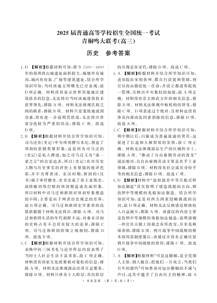 河南省重点高中2025届高三年级青桐鸣11月大联考 历史答案