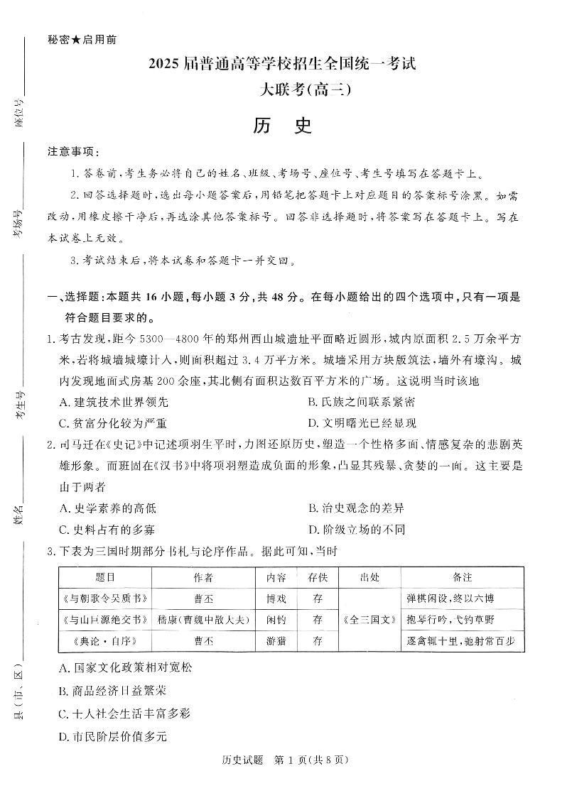 河南省重点高中2025届高三年级青桐鸣11月大联考 历史