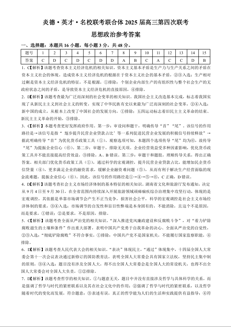 湖南省炎德英才名校联考联合体2025届高三第四次联考 政治答案