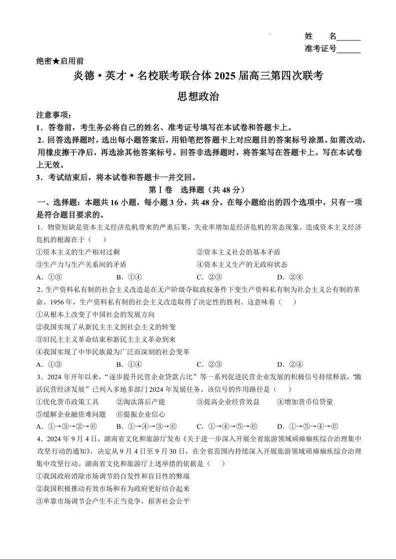湖南省炎德英才名校联考联合体2025届高三第四次联考 政治