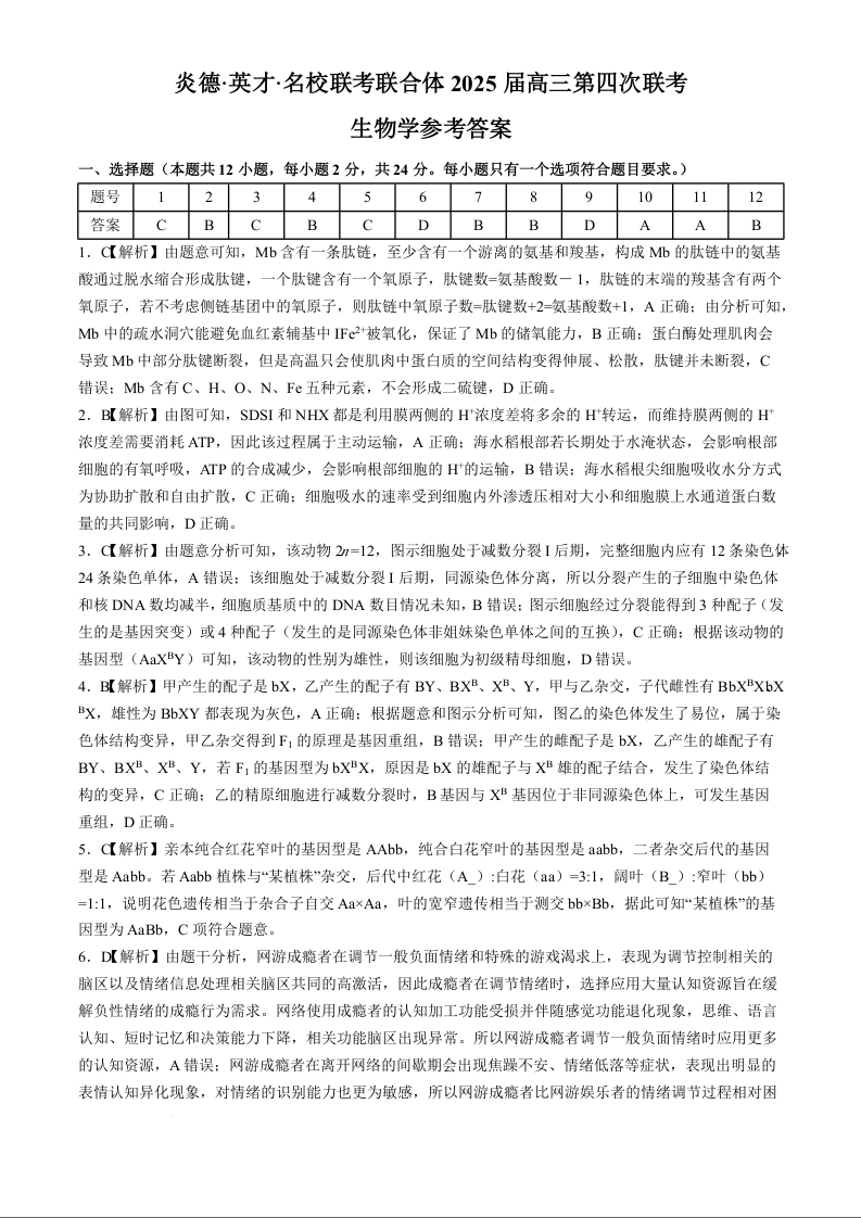 湖南省炎德英才名校联考联合体2025届高三第四次联考 生物答案