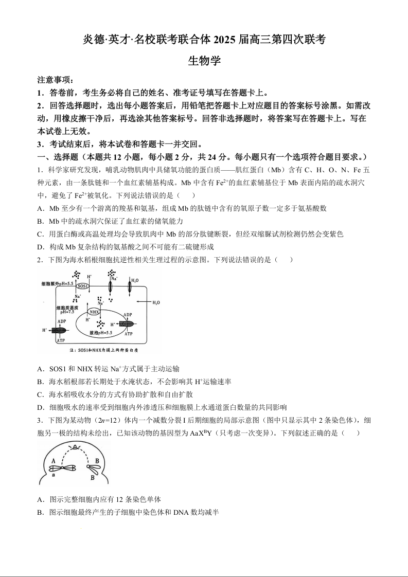 湖南省炎德英才名校联考联合体2025届高三第四次联考 生物