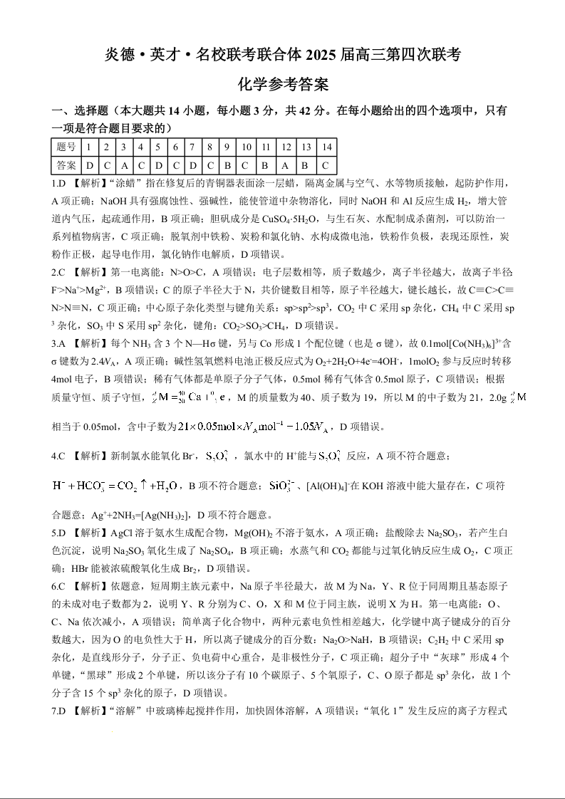 湖南省炎德英才名校联考联合体2025届高三第四次联考 化学答案