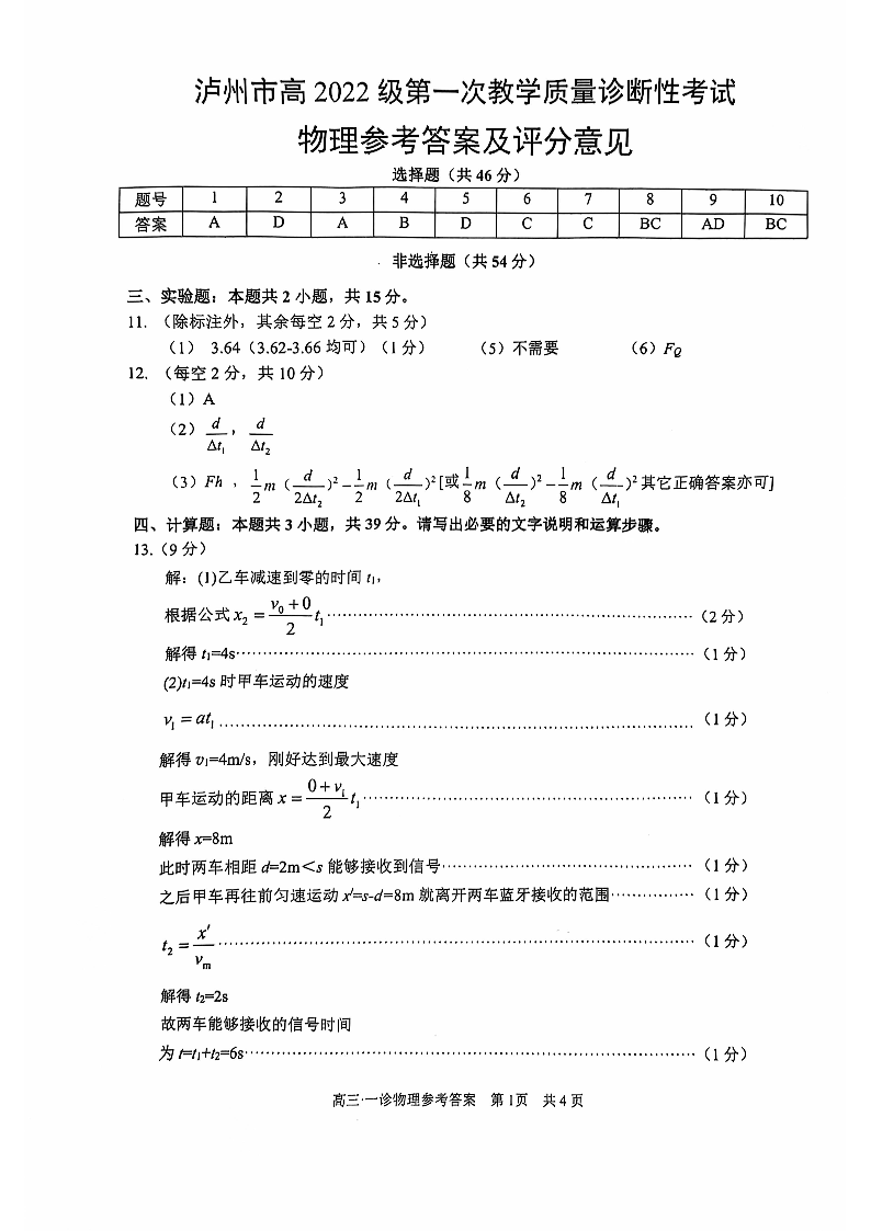 泸州市高2022级第一次教学质量诊断性考试 物理答案