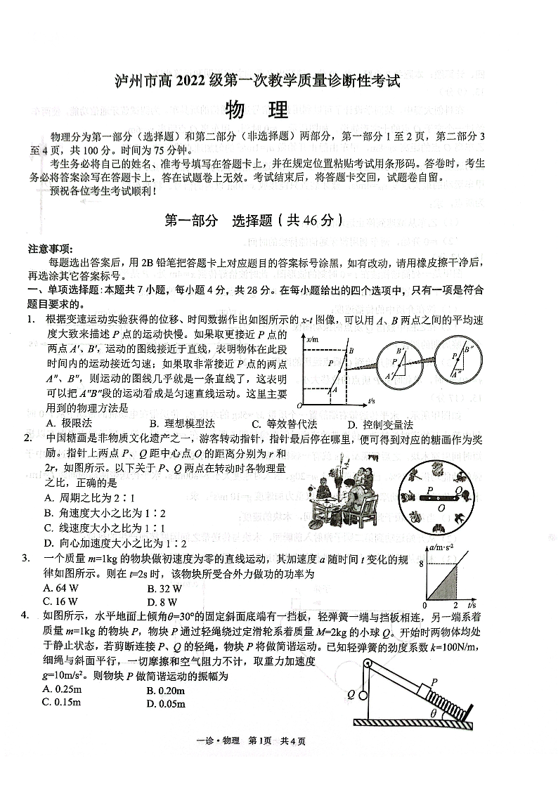 泸州市高2022级第一次教学质量诊断性考试 物理