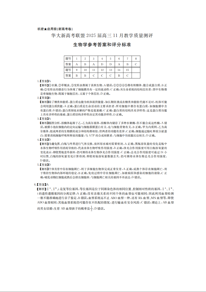 华大新高考联盟2025届高三11月教学质量测评 生物答案