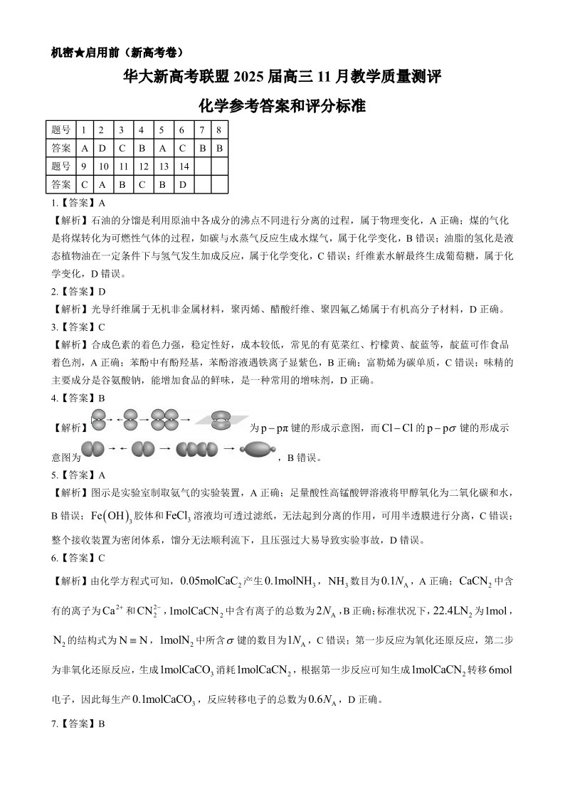华大新高考联盟2025届高三11月教学质量测评 化学答案