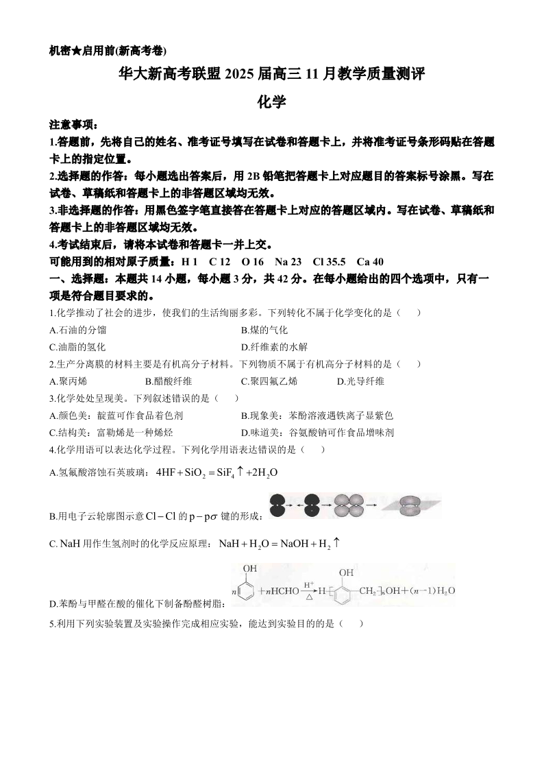 华大新高考联盟2025届高三11月教学质量测评 化学
