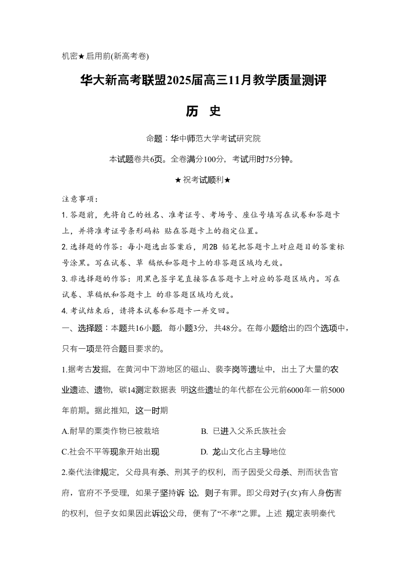 华大新高考联盟2025届高三11月教学质量测评 历史