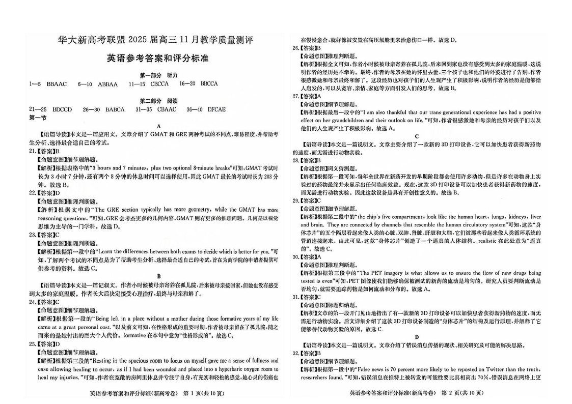 华大新高考联盟2025届高三11月教学质量测评 英语答案