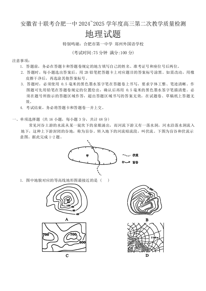安徽省十联考合肥市第一中学2025届高三上学期第二次教学检测 地理