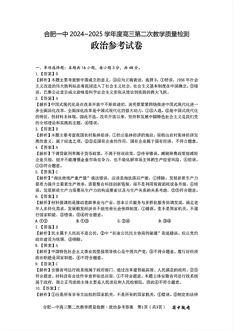 安徽省十联考合肥市第一中学2025届高三上学期第二次教学检测 政治答案