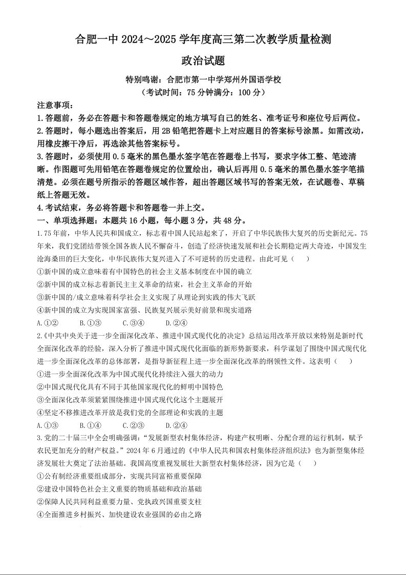 安徽省十联考合肥市第一中学2025届高三上学期第二次教学检测 政治