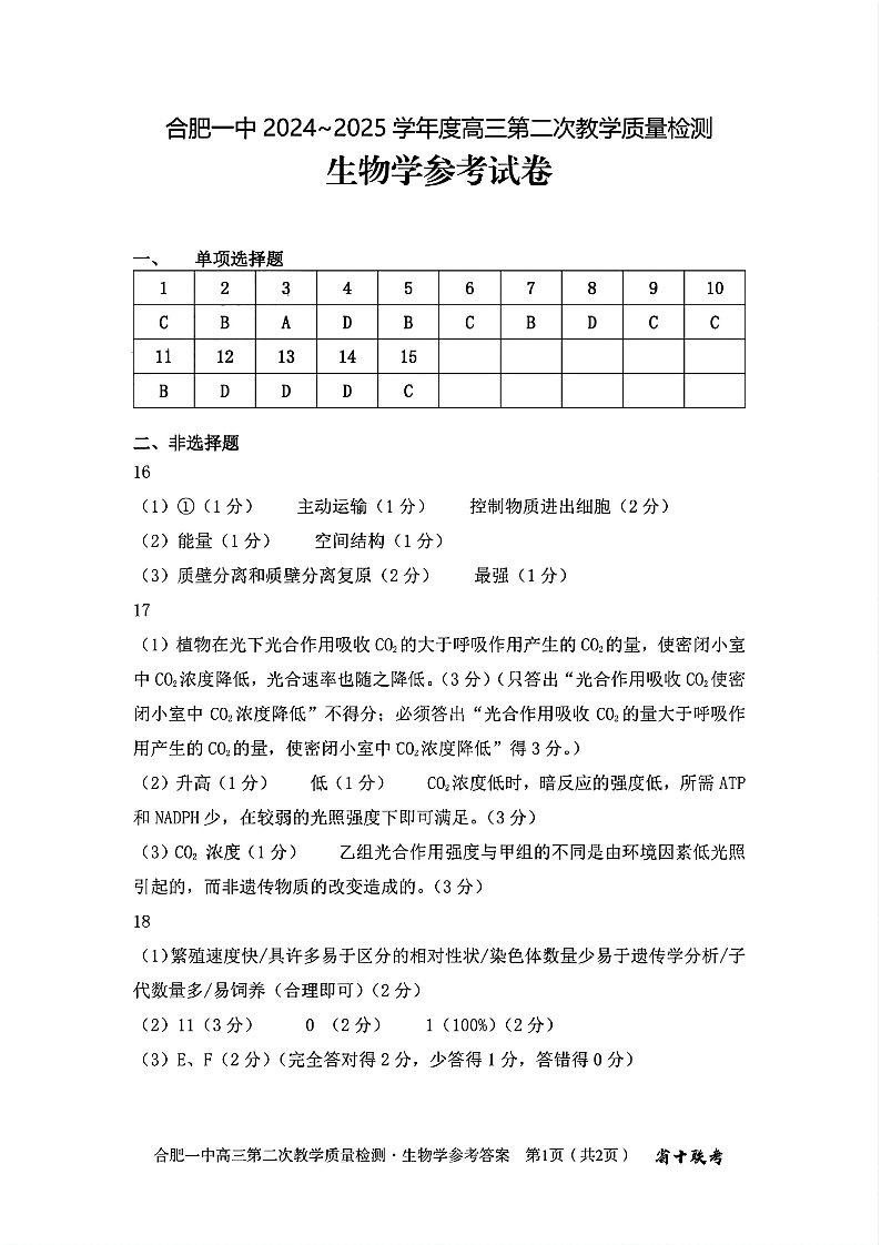 安徽省十联考合肥市第一中学2025届高三上学期第二次教学检测 生物答案