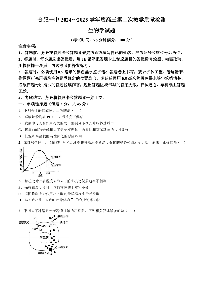 安徽省十联考合肥市第一中学2025届高三上学期第二次教学检测 生物