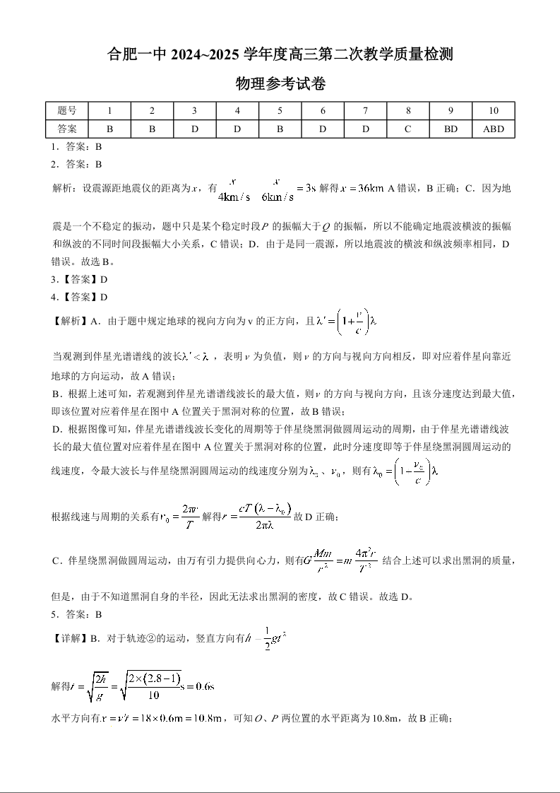 安徽省十联考合肥市第一中学2025届高三上学期第二次教学检测 物理答案