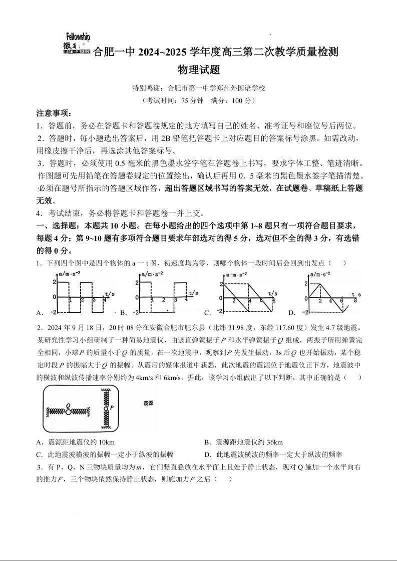 安徽省十联考合肥市第一中学2025届高三上学期第二次教学检测 物理