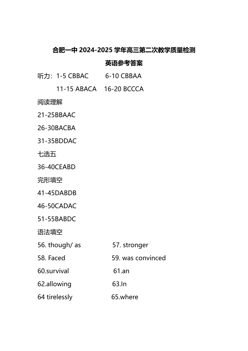安徽省十联考合肥市第一中学2025届高三上学期第二次教学检测 英语答案