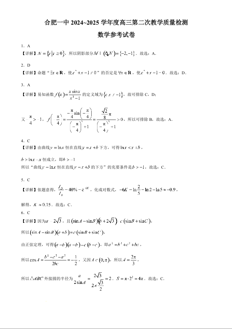 安徽省十联考合肥市第一中学2025届高三上学期第二次教学检测 数学答案
