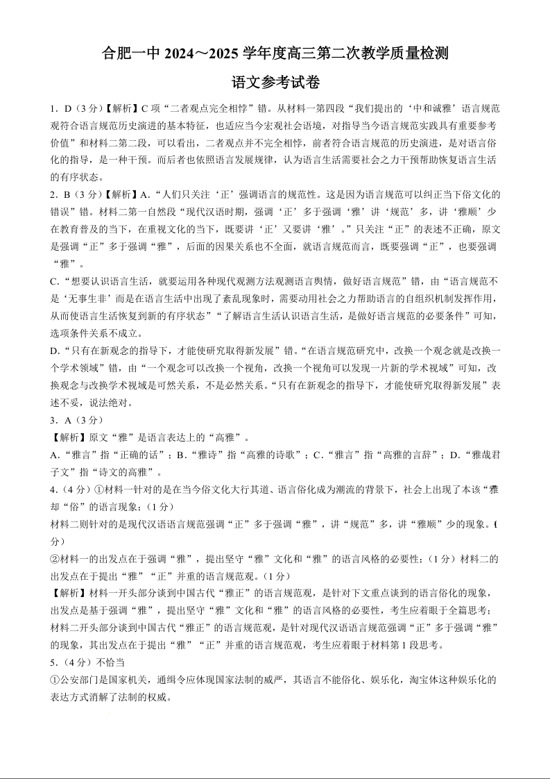 安徽省十联考合肥市第一中学2025届高三上学期第二次教学检测 语文答案