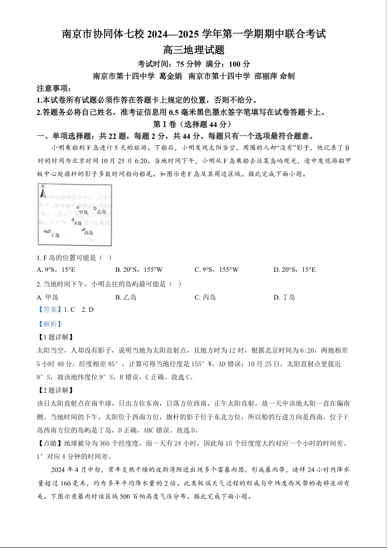 江苏省南京市协同体七校2024-2025学年高三上学期期中联合考试 地理答案