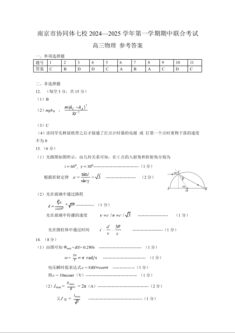 江苏省南京市协同体七校2024-2025学年高三上学期期中联合考试 物理答案