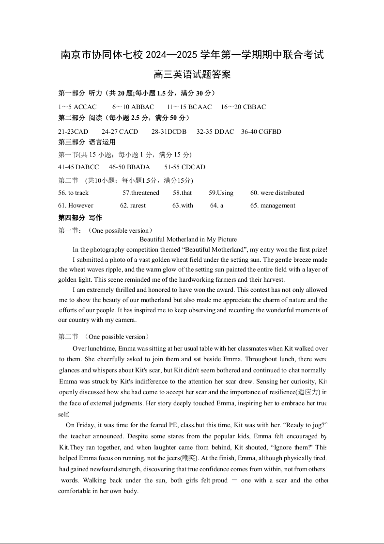 江苏省南京市协同体七校2024-2025学年高三上学期期中联合考试 英语答案